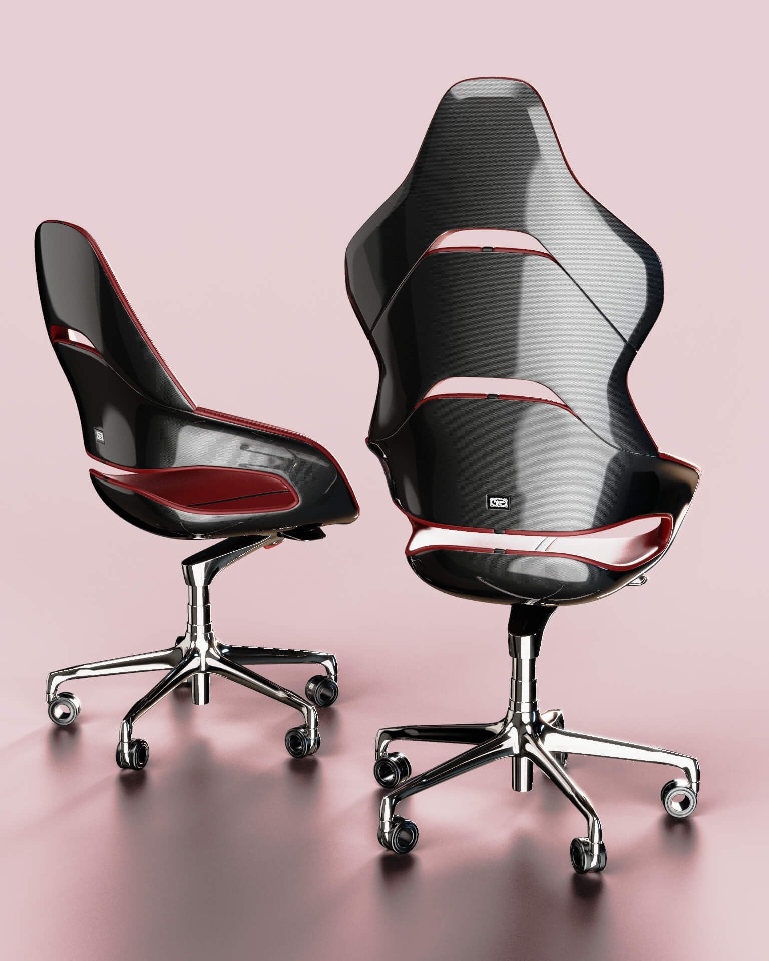 Renderização de cadeiras de escritório Poltrona Frau Cockpit. O modelo é uma criação da marca em homenagem ao 70º aniversário da fabricante de carros Ferrari e as imagens foram criadas utilizando Keyshot 11, demonstrando materiais como couro, tecidos e costuras, fibra de carbono e metais.