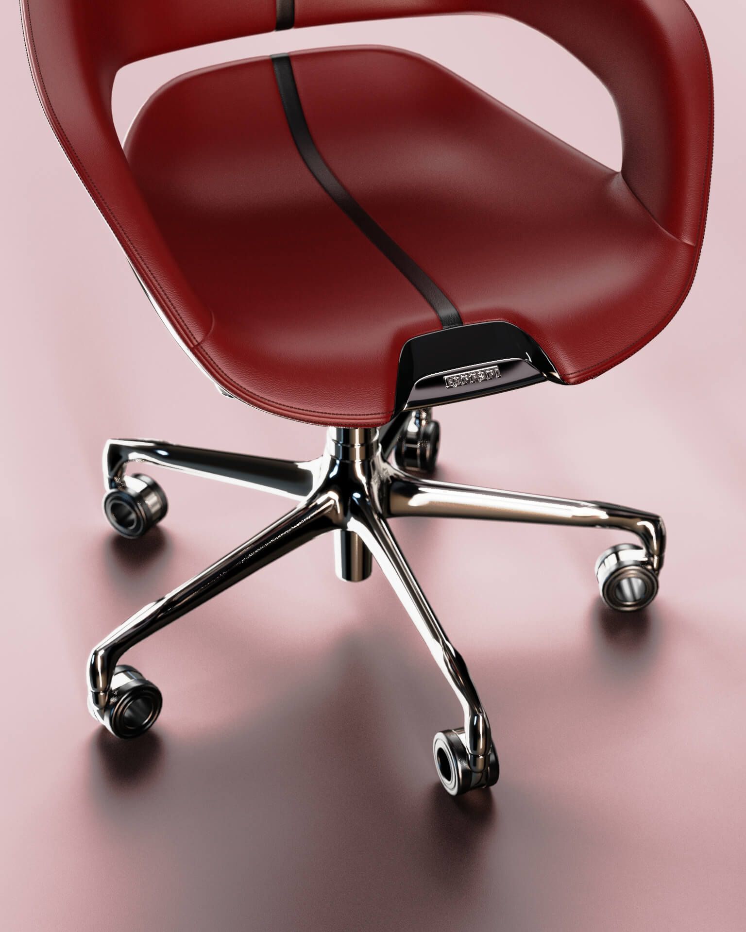 Rendering of Poltrona Frau Cockpit office chairs. The model was created by the brand in honor of the 70th anniversary of the car manufacturer Ferrari. The images were created using Keyshot 11, demonstrating materials such as leather, fabrics and stitching, carbon fiber, and metals.