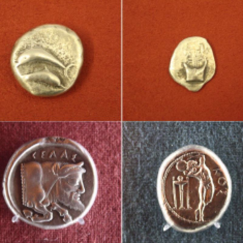 The chosen symbols harken back to Greek and Roman traditions, where coins were minted by hand in metal, creating characteristic creases and edges on each piece.