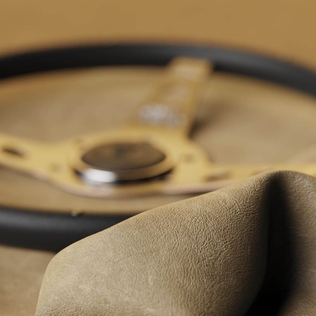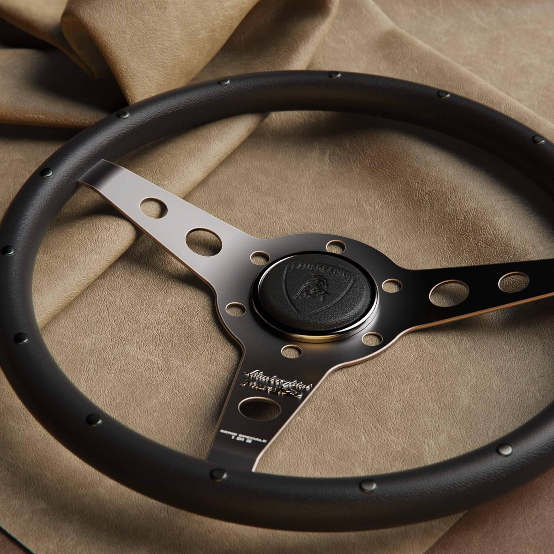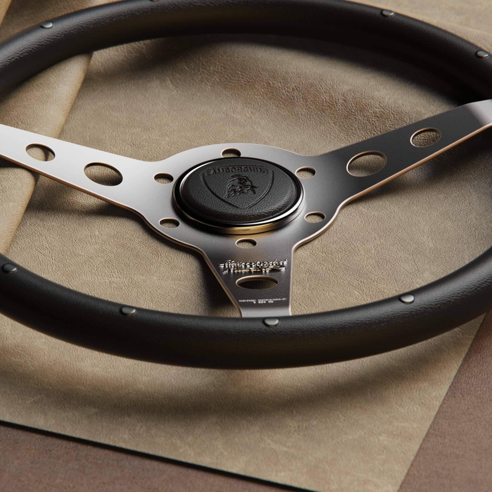 Estudo de modelagem CAD 3D, via Autodesk Fusion 360, de um conceito de volante em homenagem ao 50º aniversário do Lamborghini Miura. Na renderização, o foco foi expor as características simuladas de materiais como couro, utilizando o software Luxion Keyshot 11.