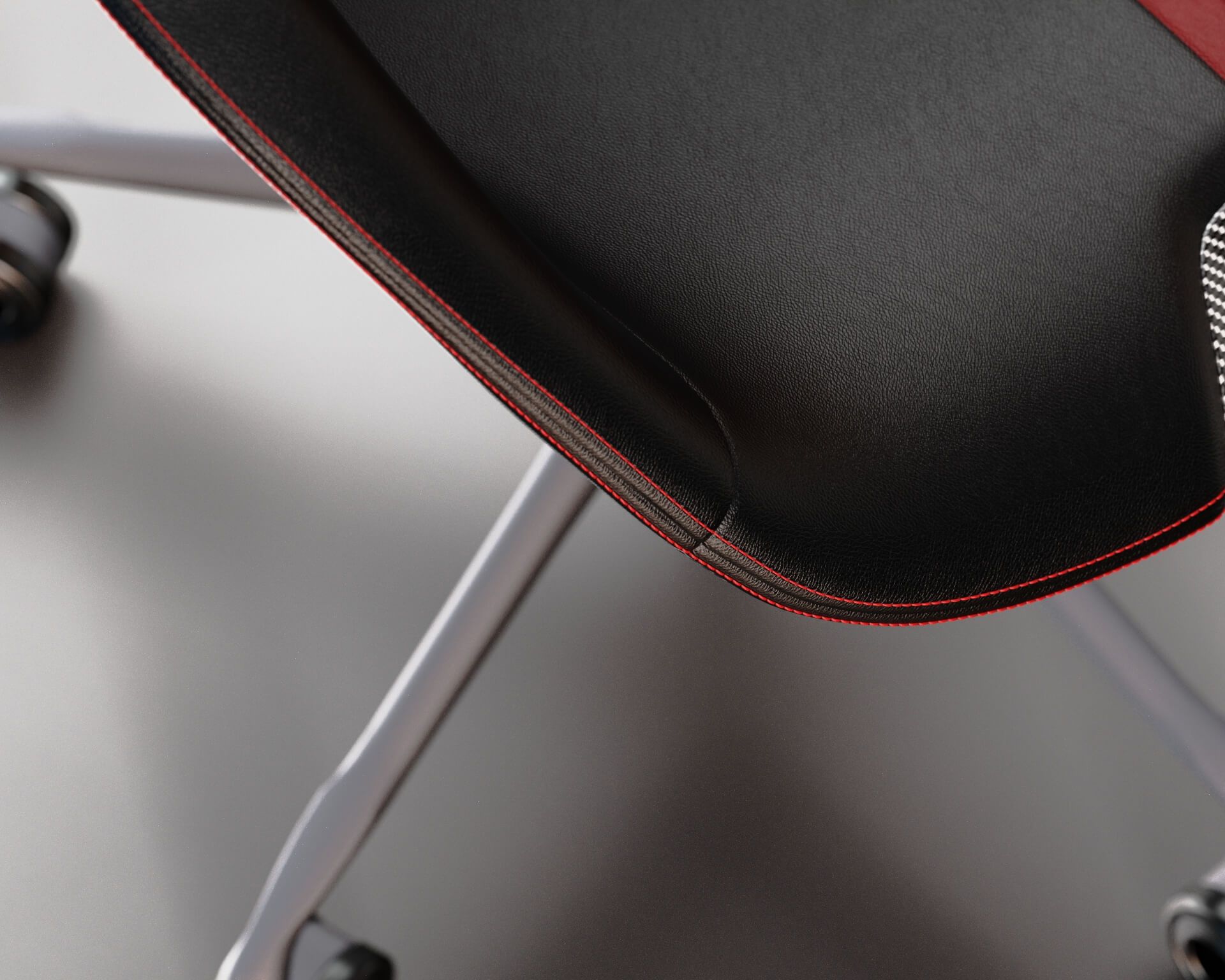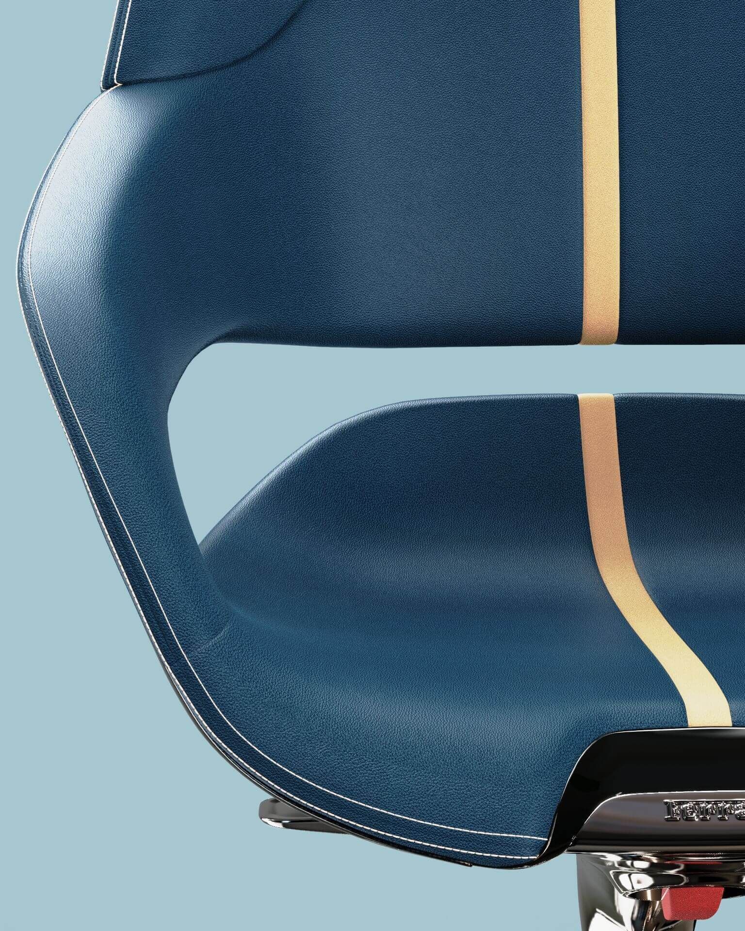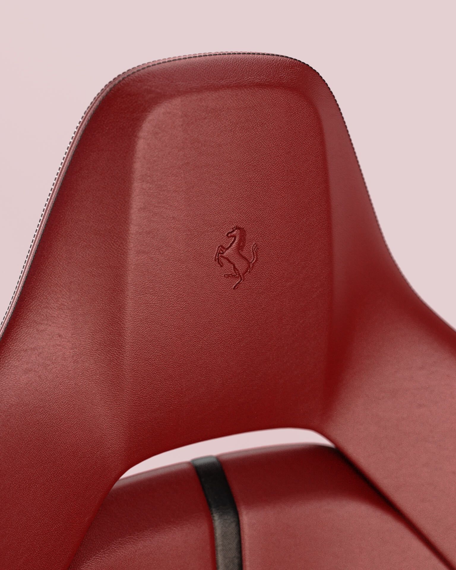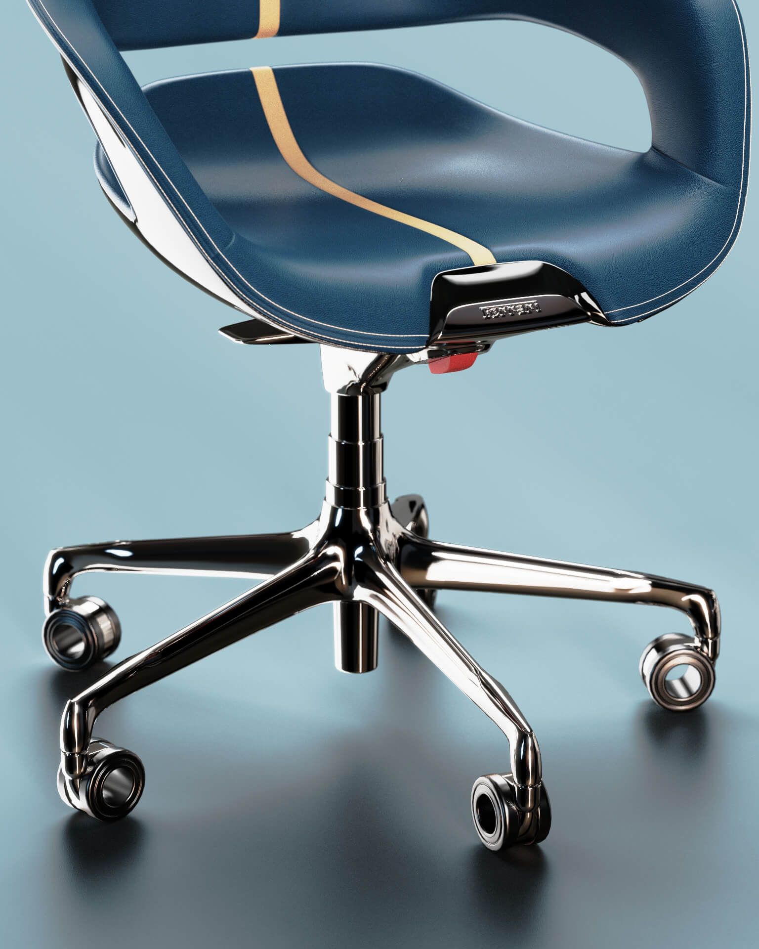 Rendering of Poltrona Frau Cockpit office chairs. The model was created by the brand in honor of the 70th anniversary of the car manufacturer Ferrari. The images were created using Keyshot 11, demonstrating materials such as leather, fabrics and stitching, carbon fiber, and metals.