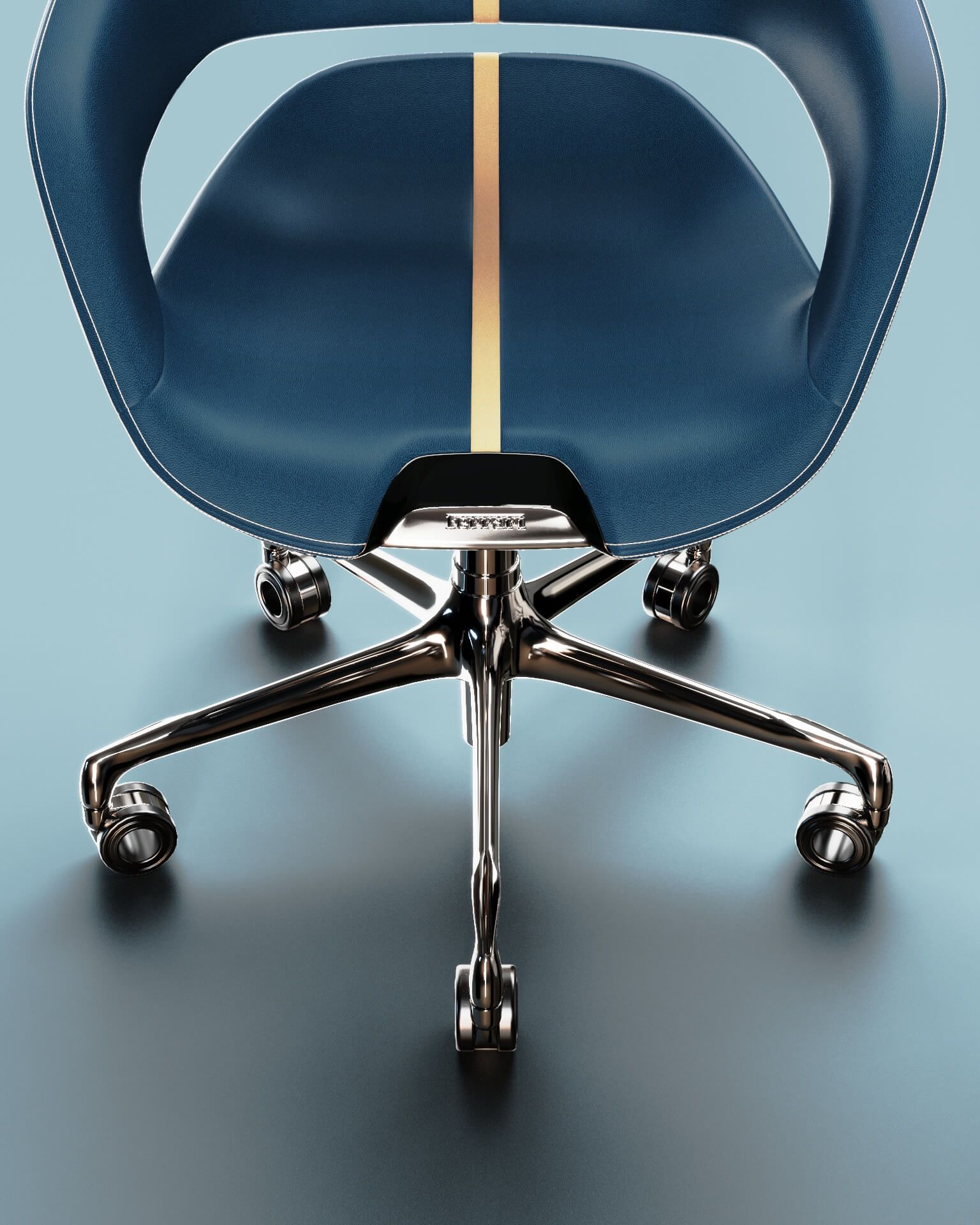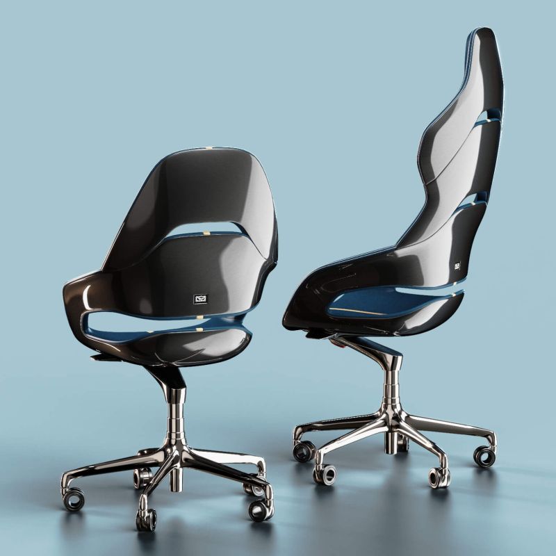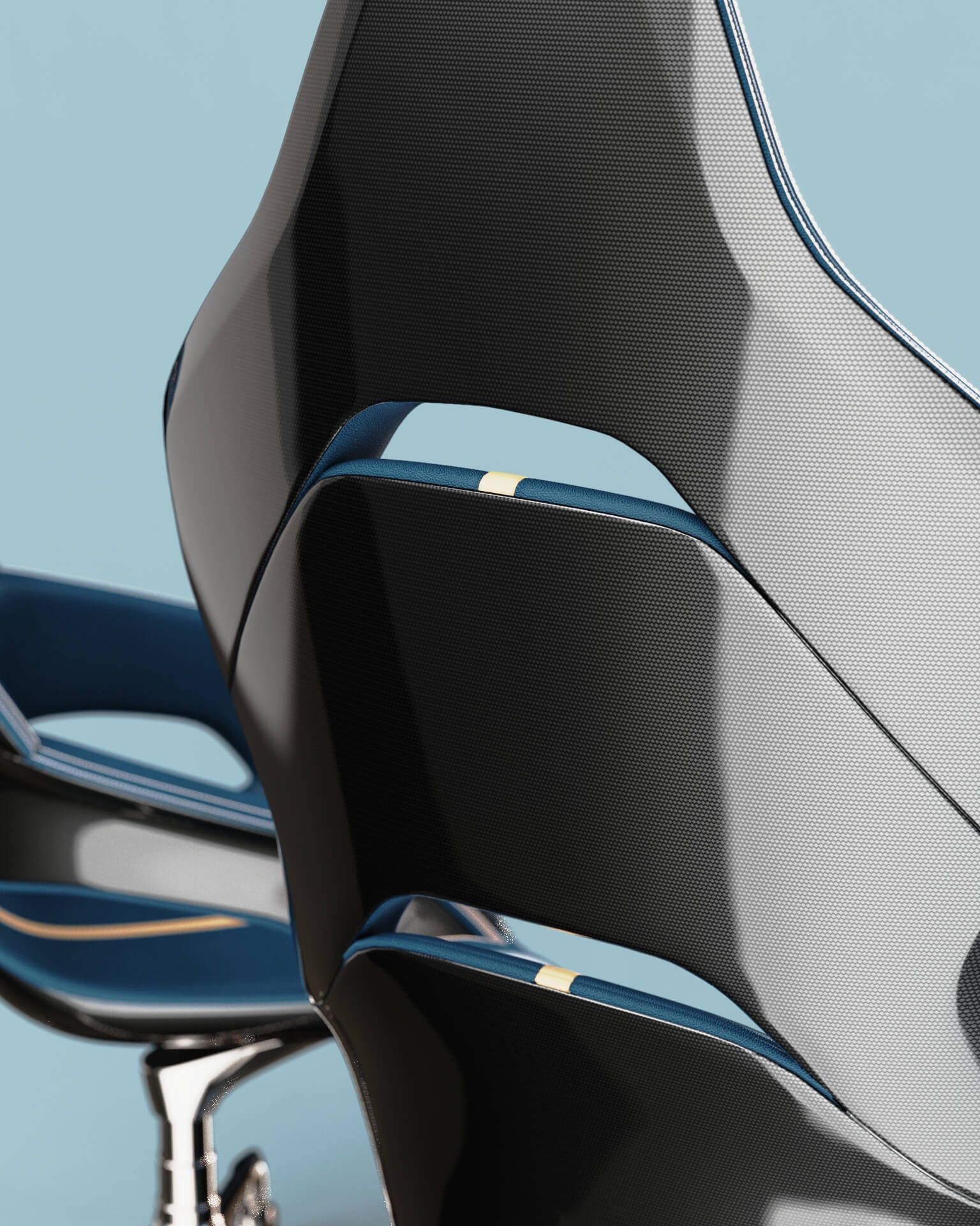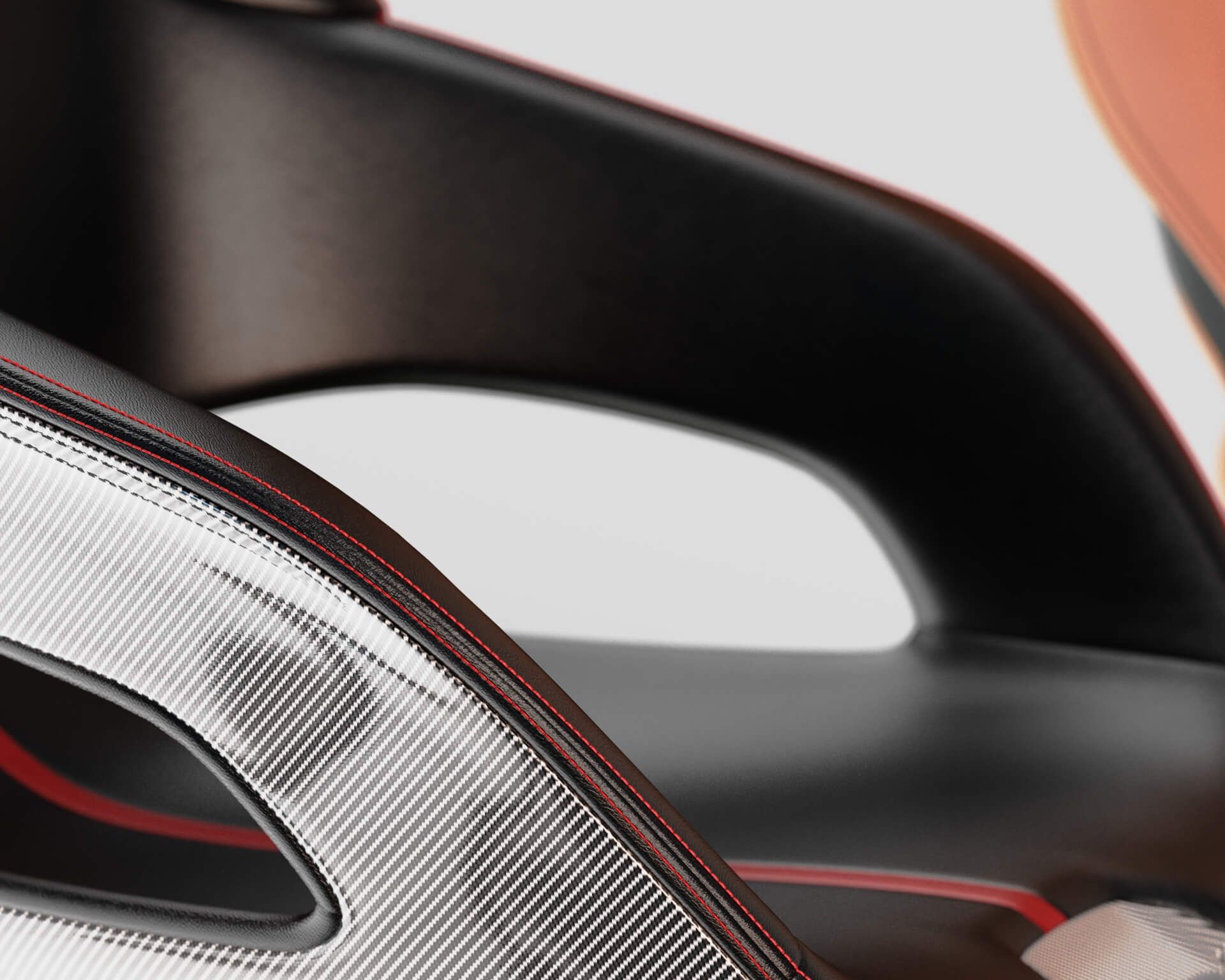 Rendering of Poltrona Frau Cockpit office chairs. The model was created by the brand in honor of the 70th anniversary of the car manufacturer Ferrari. The images were created using Keyshot 11, demonstrating materials such as leather, fabrics and stitching, carbon fiber, and metals.