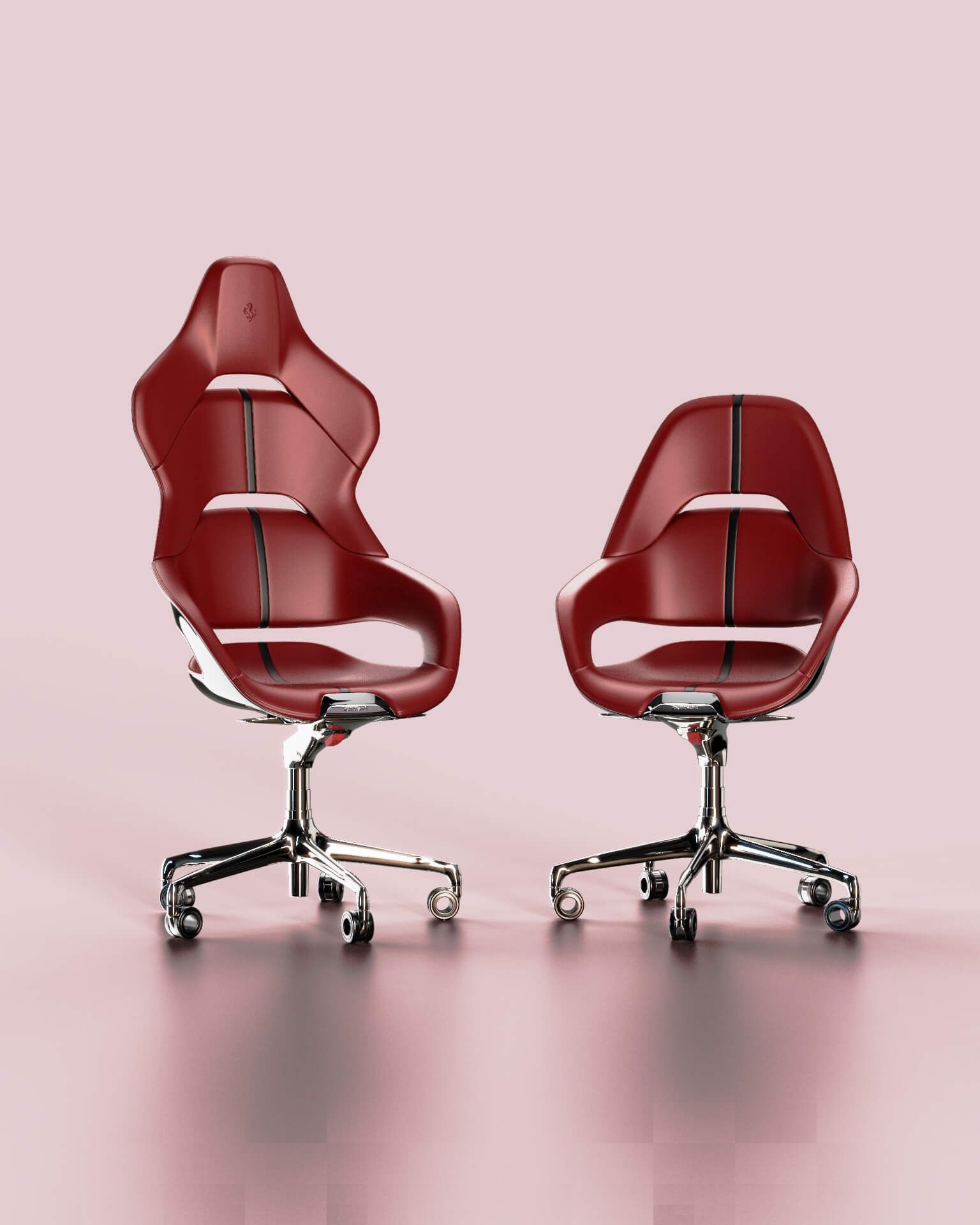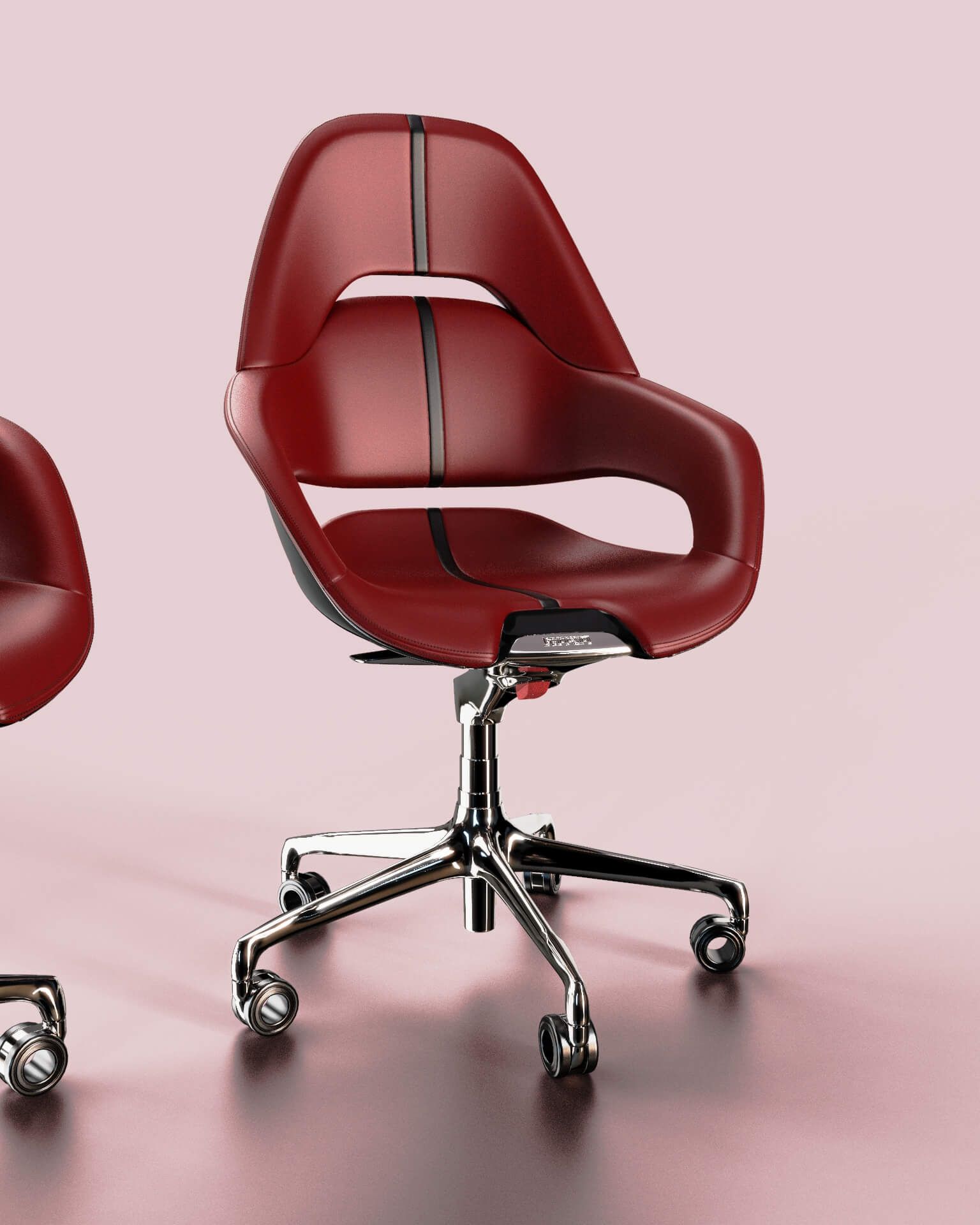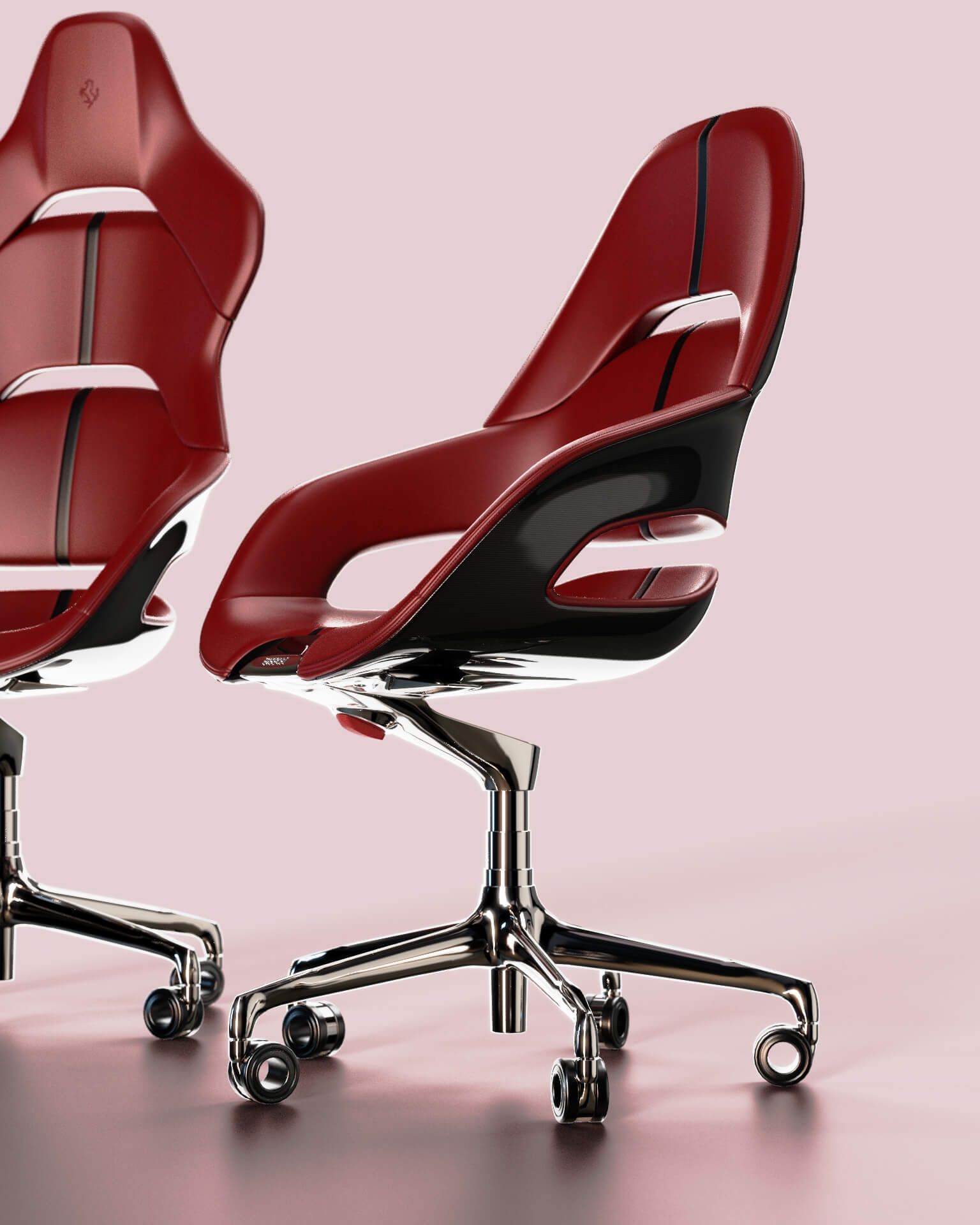 Renderização de cadeiras de escritório Poltrona Frau Cockpit. O modelo é uma criação da marca em homenagem ao 70º aniversário da fabricante de carros Ferrari e as imagens foram criadas utilizando Keyshot 11, demonstrando materiais como couro, tecidos e costuras, fibra de carbono e metais.